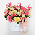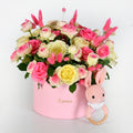 Welcome the new baby girl with a stunning mix of flowers in a pink box, complemented by a handcrafted pink wool rattle from local Lebanese artisans. A perfect duo to celebrate the little one’s big arrival!